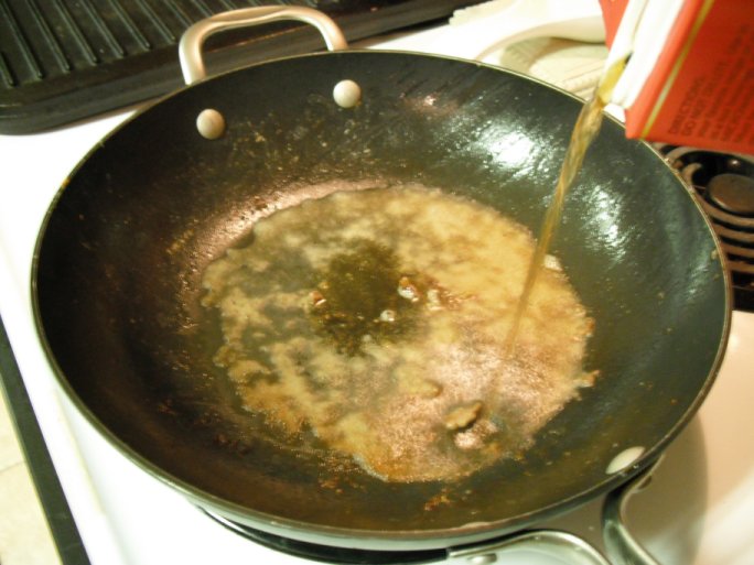 Place the pan back on the stovetop and deglaze it by adding the reserved beef broth carefully. Let it simmer a little bit and stir it around getting all those little bits and pieces from the bottom of the pan. Then transfer all of it to the crock pot and stir everything up well.