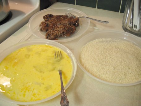 I have 2 eggs beaten with a splash of milk in one tray. Panko bread crumbs in another tray and some Flour in another. And of course, the meat.