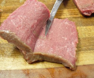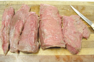 The first thing I do is to clean up the backstraps or tenderloin by taking a very sharp fillet knife and shaving off any sinewy fat or brownish areas. These brownish areas happen during freezing and I don't think they are bad meat in any way, I just don't like the look of it.