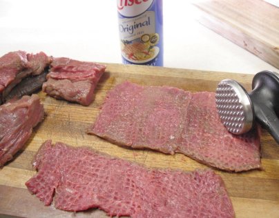 Now take your meat mallet and pound out the sections to about 1/4" thick. I spray a little cooking spray on my mallet to keep the meat from sticking to it as I pound it down. The pieces will be uneven shapes, but that's the beauty of it...in my humble opinion.