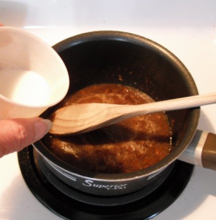 Mix the cornstarch in a small cup with the water until dissolved. With a wire whisk, mix the cornstarch/water into the pan a little at a time. The sauce should not become thick like a gravy. You want it kind of thin. When it's where you like it turn off the heat and set aside.